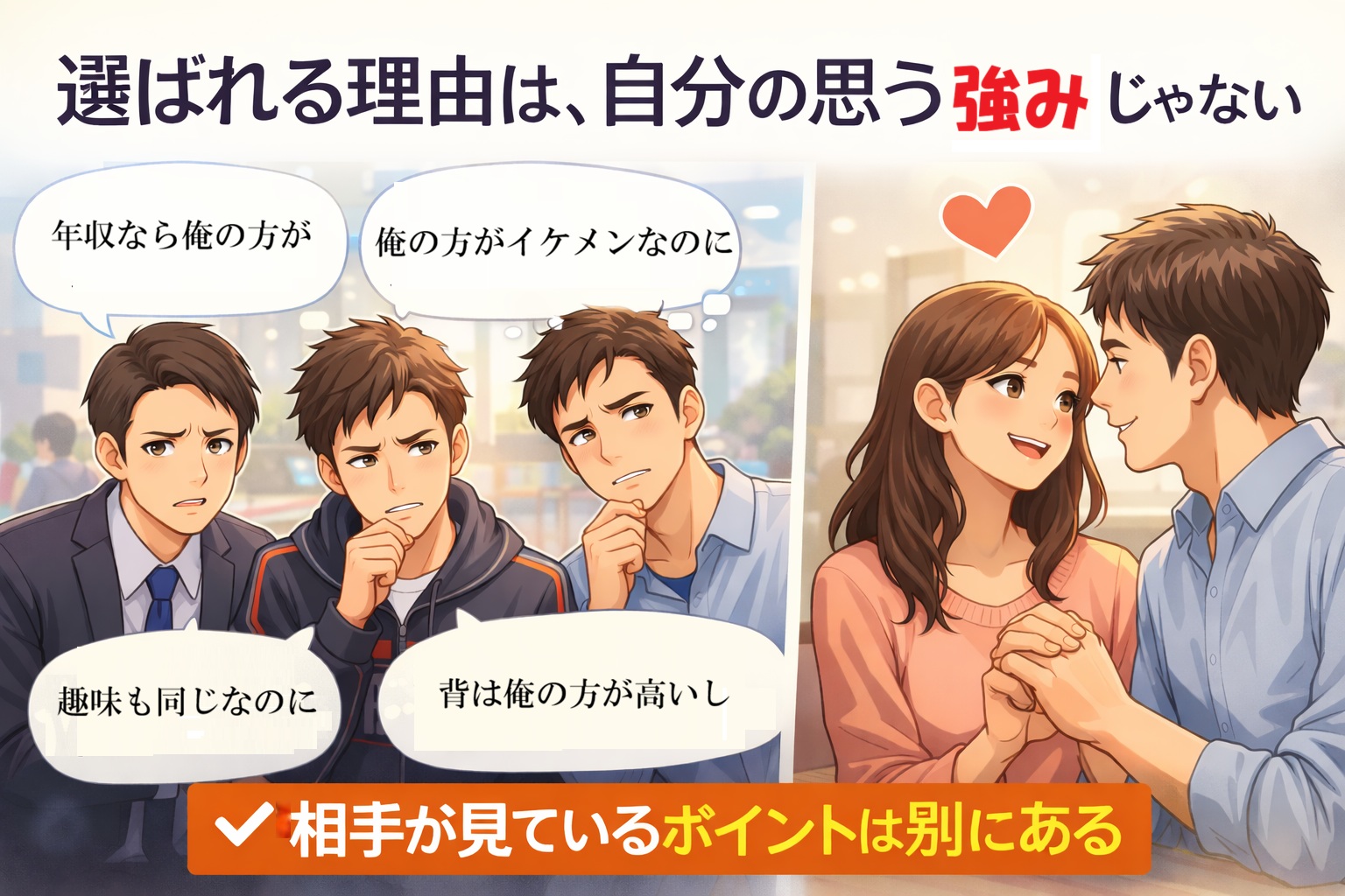 婚活でうまくいかない男性ほど、こう思っています。 「自分の方が条件はいいのに…」 年収もある 見た目も悪くない 学歴だって負けていない それなのに、なぜか選ばれない。 逆に「なんであの人が?」と思う男性が、あっさり結婚し […]