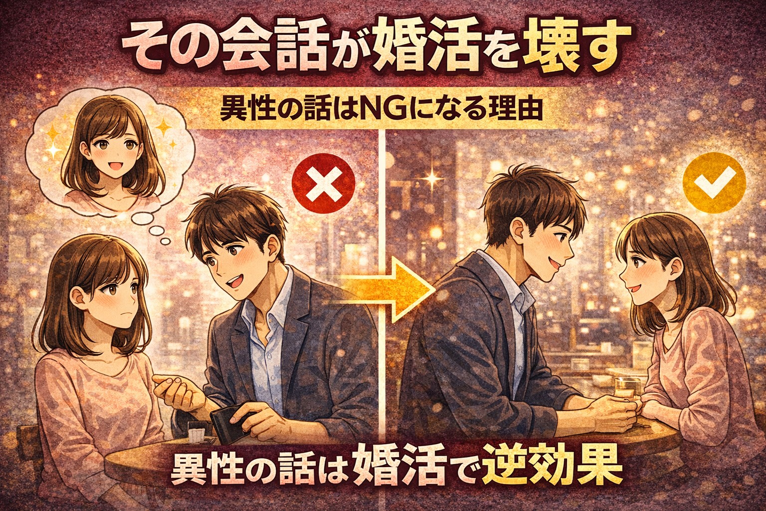 婚活において、会話の内容は相手の印象を大きく左右します。 特に注意すべきなのは、異性の友人や知人を褒める会話です。 たとえ悪意がなくても、異性を褒める話は相手に不快感や不安を与え、関係に悪影響を及ぼす可能性があります。 […]