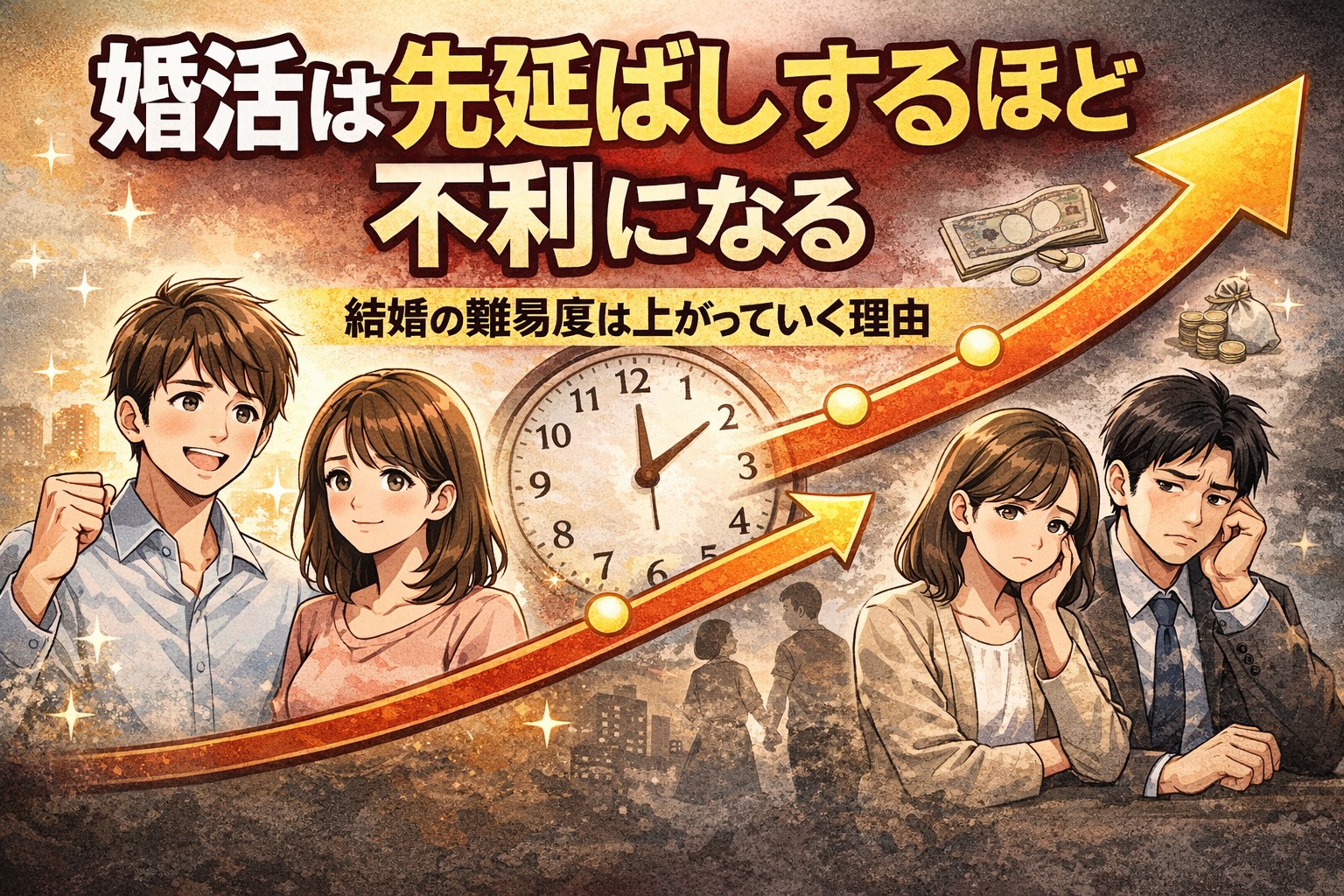 婚活は、いつ始めても同じ結果になるわけではありません。 現実には、先延ばしにするほど結婚の難易度は確実に上がっていきます。 これは心理学で「エメットの法則」と呼ばれる現象にも通じます。 つまり、「後でやろう」と思っている […]